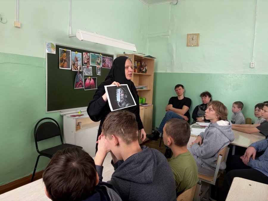 22 января 2026г. воспитанники и преподаватели нашей воскесной школы побывали в гостях в ГКОУ "Головинщинская школа-интернат". Директор воскресной школы инокиня Магдалина провела интерактивное занятие со старшими воспитанниками школы-интерната о сотворении мира, о первородном грехе и его последствиях, таких, как зависимость от телефона, курение, употребление алкоголя, наркотических веществ. Беседа получилась интересной и оживленной, подростки задавали вопросы, сами активно отвечали.